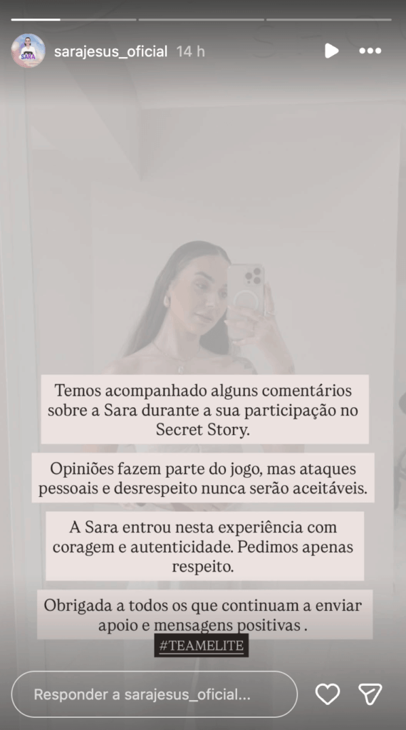 “Temos acompanhado alguns comentários sobre a Sara durante a sua participação no Secret Story. Opiniões fazem parte do jogo, mas ataques pessoais e desrespeito nunca serão aceitáveis.”, começou por dizer a família.