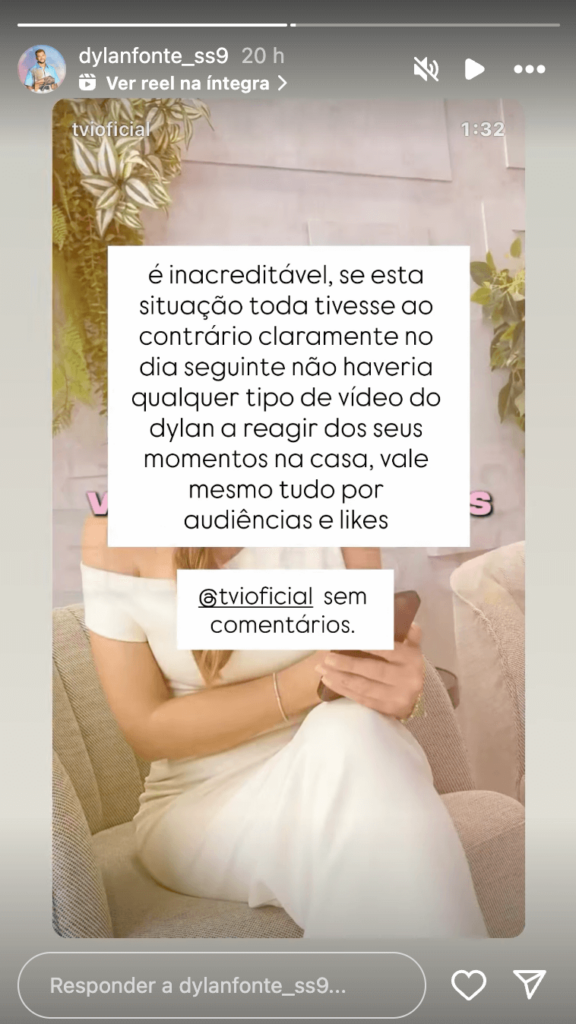 “É inacreditável, se esta situação toda tivesse ao contrário, claramente no dia seguinte não haveria qualquer tipo de vídeo do Dylan a reagir dos seus momentos na casa, vale mesmo tudo por audiências e likes”, começou por reagir a família/ equipa de Dylan. “TVI sem comentários.”, acrescentaram.