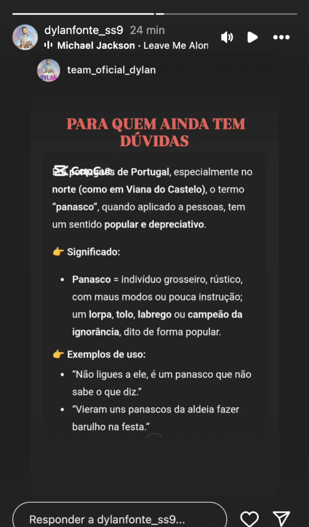 Entretanto, a família/ equipa do concorrente também reagiram e fizeram um esclarecimento deixando claro o significado de ‘panasco’ na região de Viana do Castelo, “para quem ainda tem dúvidas”.