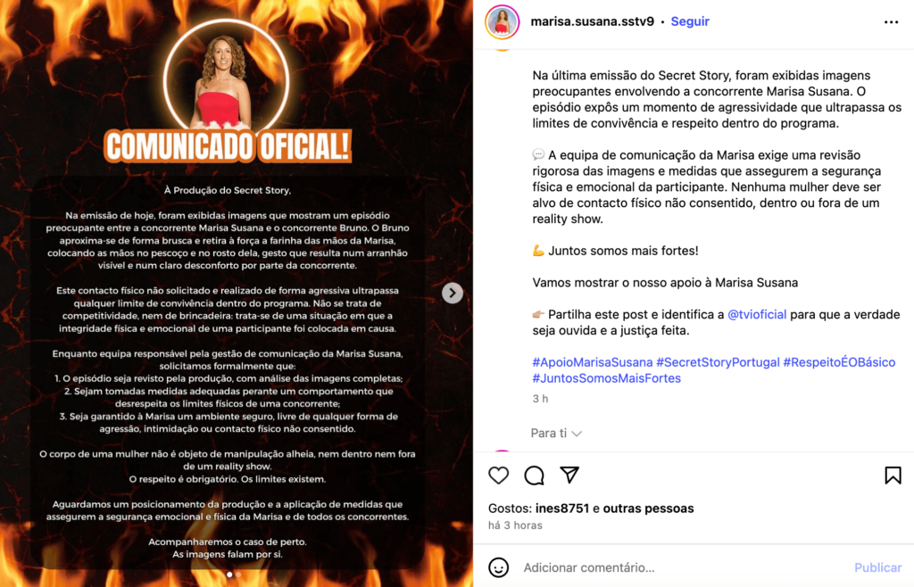 Na legenda da publicação do comunicado, a equipa da concorrente acrescentou: “Na última emissão do Secret Story, foram exibidas imagens preocupantes envolvendo a concorrente Marisa Susana. O episódio expôs um momento de agressividade que ultrapassa os limites de convivência e respeito dentro do programa. A equipa de comunicação da Marisa exige uma revisão rigorosa das imagens e medidas que assegurem a segurança física e emocional da participante. Nenhuma mulher deve ser alvo de contacto físico não consentido, dentro ou fora de um reality show.”