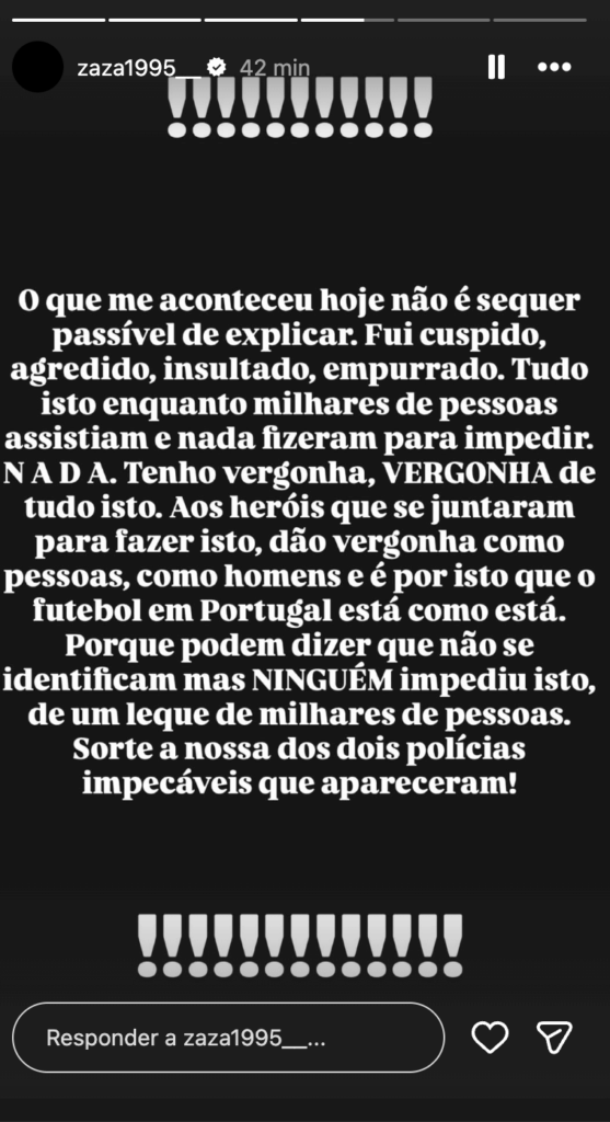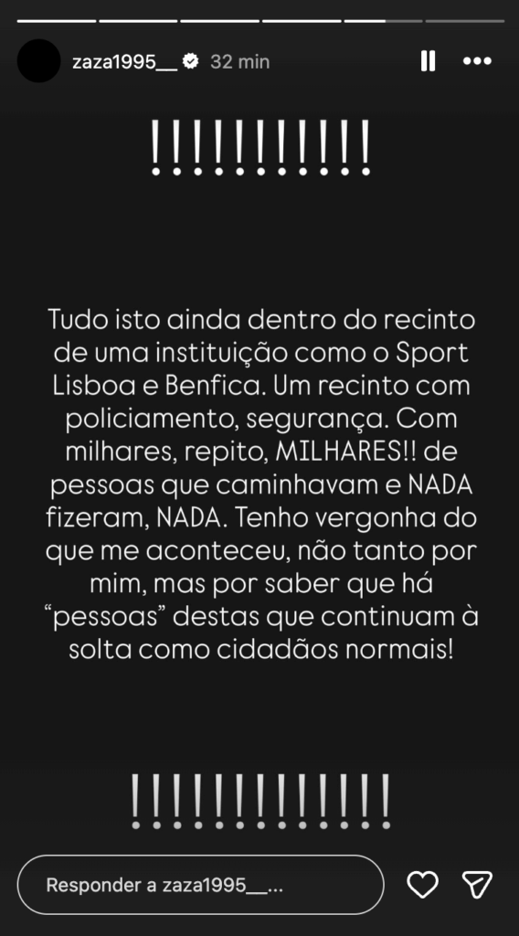 Zaza foi mais longe e destacou o facto de tudo ter acontecido dentro de um recinto com policiamento e segurança, perante milhares de pessoas que não fizeram nada para travar a situação: “Tudo isto ainda dentro do recinto de uma instituição como o Sport Lisboa e Benfica. Um recinto com policiamento, segurança. Com milhares, repito, MILHARES!! de pessoas que caminhavam e NADA fizeram, NADA. Tenho vergonha do que me aconteceu, não tanto por mim, mas por saber que há ‘pessoas’ destas que continuam à solta como cidadãos normais!”