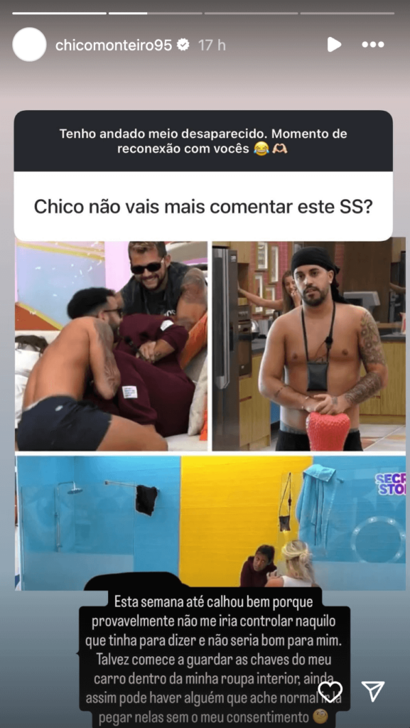 “Esta semana até calhou bem porque provavelmente não me iria controlar naquilo que tinha para dizer e não seria bom para mim.”, começou por dizer Francisco Monteiro, que acrescentou de seguida: “Talvez comece a guardar as chaves do meu carro dentro da minha roupa interior, ainda assim pode haver alguém que ache norma pegar nelas sem o meu consentimento.“