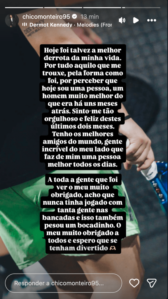 Numa partilha emotiva e reflexiva, Francisco Monteiro abriu o coração sobre o significado desta derrota e sobre a transformação pessoal que tem vivido: “Hoje foi talvez a melhor derrota da minha vida. Por tudo aquilo que me trouxe, pela forma como foi, por perceber que hoje sou uma pessoa, um homem muito melhor do que era há uns meses atrás. Sinto-me tão orgulhoso e feliz destes últimos dois meses.”