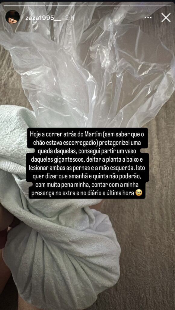 “Hoje, ao correr atrás do Martim, sem saber que o chão estava escorregadio, protagonizei uma queda daquelas, consegui partir um vaso daqueles gigantescos, deitar a planta abaixo e lesionar ambas as pernas e a mão esquerda“, começou por contar Zaza.