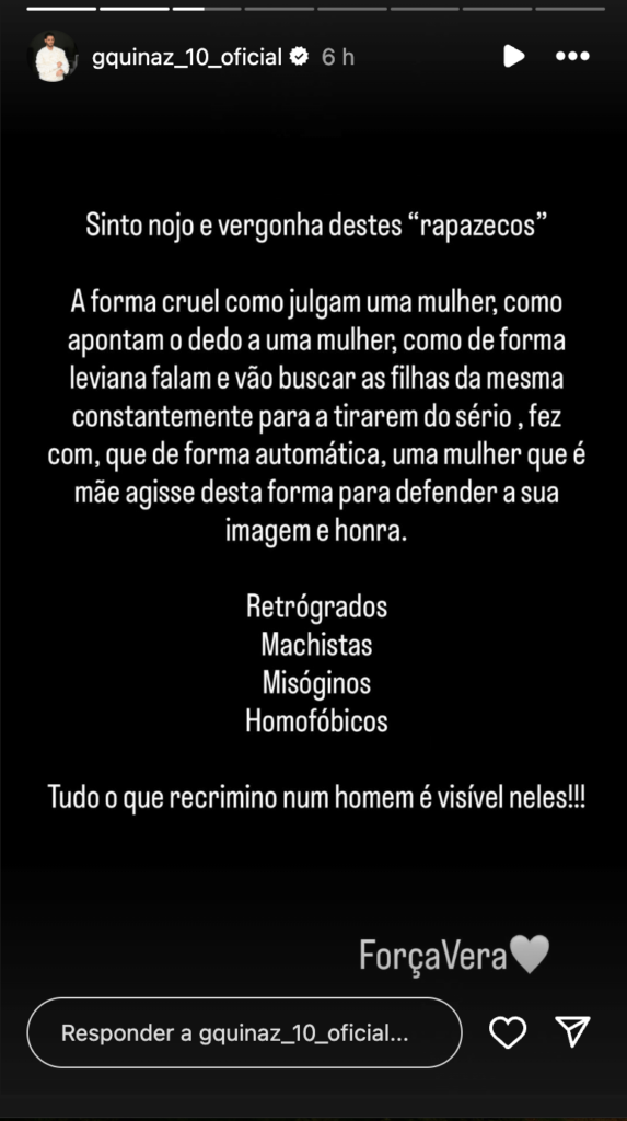 Indignado, o comentador da TVI não ficou por aqui e deixou duras críticas a Dylan e a Bruno: “Retrógrados, Machistas, Misóginos, Homofóbicos. Tudo o que recrimino num homem é visível neles!!!”. Quinaz rematou com uma mensagem para Vera: “Força Vera”