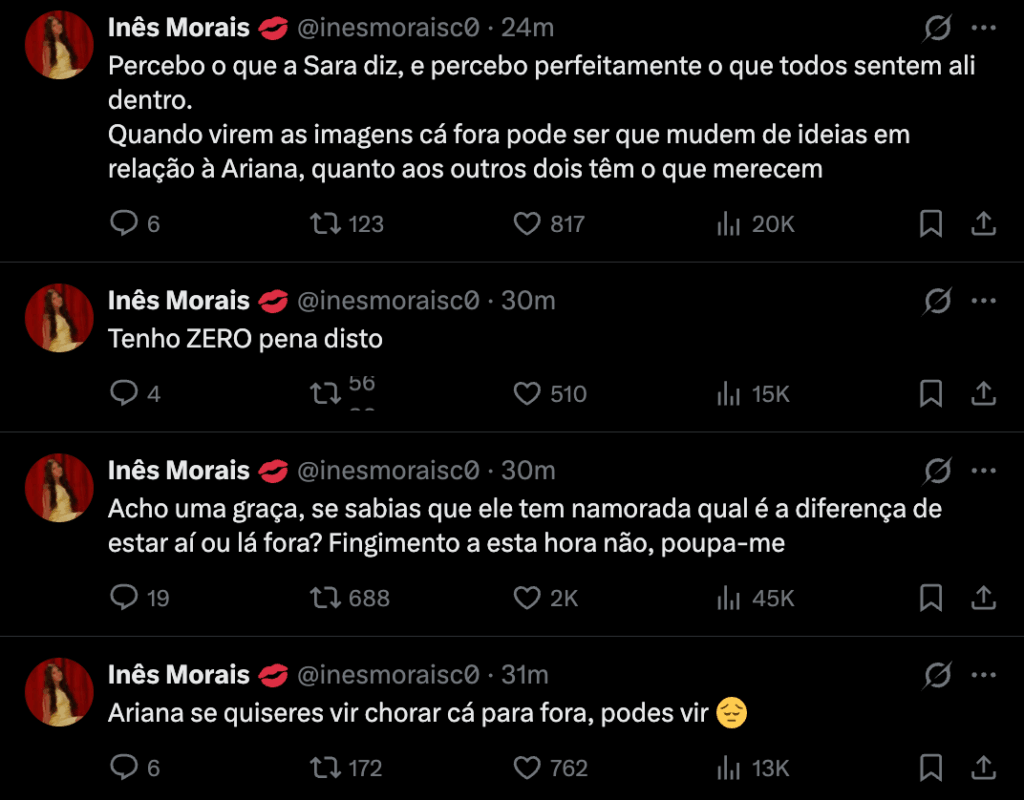 Inês Morais deixou ainda claro que não tem qualquer compaixão pela situação de Ariana: “Tenho ZERO pena disto.” A comentadora fechou com uma previsão sobre o que espera quando os concorrentes virem as imagens cá fora e deixou claro que a sua leitura sobre cada um dos envolvidos está bem definida: “Percebo o que a Sara diz, e percebo perfeitamente o que todos sentem ali dentro. Quando virem as imagens cá fora pode ser que mudem de ideias em relação à Ariana, quanto aos outros dois têm o que merecem.”