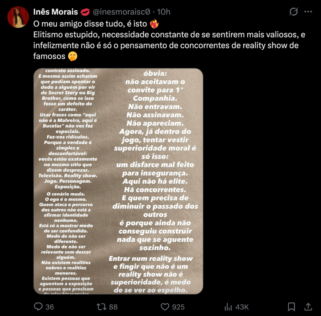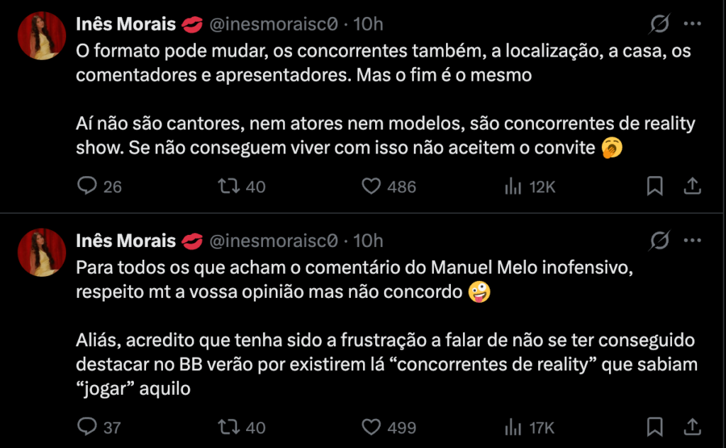 Inês Morais rematou com um recadinho direto: “O formato pode mudar, os concorrentes também, a localização, a casa, os comentadores e apresentadores. Mas o fim é o mesmo Aí não são cantores, nem atores nem modelos, são concorrentes de reality show. Se não conseguem viver com isso não aceitem o convite”.