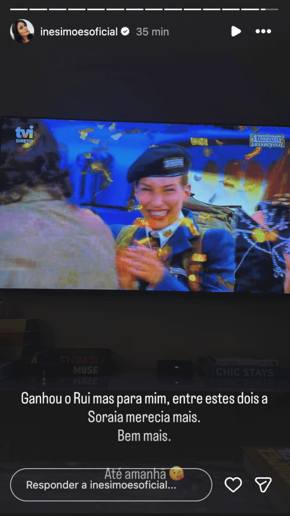 Inês Simões foi direta e clara na manifestação do seu desagrado com o resultado, deixando uma mensagem nas redes sociais que não deixou margem para dúvidas: “Ganhou o Rui mas para mim, entre estes dois a Soraia merecia mais. Bem mais. Até amanhã.”
