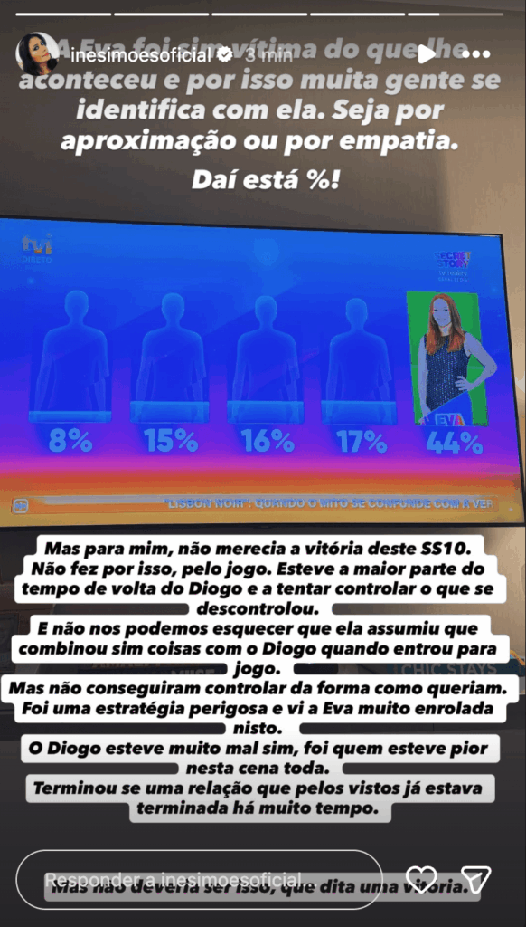 No entanto, Inês Simões não ficou pela empatia e foi mais longe, deixando claro que, na sua opinião, o apoio do público não se traduz necessariamente em mérito de jogo e que não concorda com a vitória de Eva: “Mas para mim, não merecia a vitória deste Secret Story. Não fez por isso, pelo jogo. Esteve a maior parte do tempo de volta do Diogo e a tentar controlar o que se descontrolou. E não nos podemos esquecer que ela assumiu que combinou sim coisas com o Diogo quando entrou para o jogo. Mas não conseguiram controlar da forma como queriam. Foi uma estratégia perigosa e vi a Eva muito enrolada nisto.”