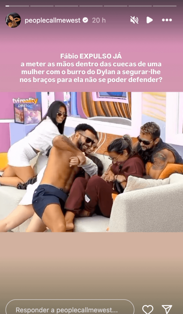 “Fábio EXPULSO JÁ.”, começou por apelar Joana Albuquerque que acrescentou de seguida: “meter as mãos dentro das cuecas de uma mulher com o burro do Dylan a segurar-lhe nos braços para ela não se poder defender?”