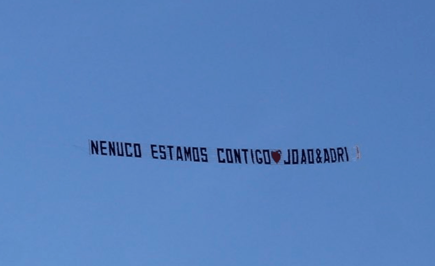 Esta tarde, 2 de abril, João surpreendeu Eva com uma mensagem que sobrevoou a casa mais vigiada do país, assinada por ele e pela namorada Adriana: “NENUCO ESTAMOS CONTIGO. JOAO & ADRI.”