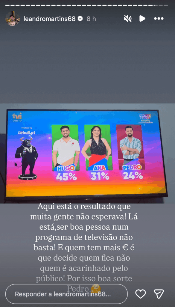 Leandro Martins, ex-concorrente do Secret Story 9 e uma das vozes mais ativas nas redes sociais ao longo desta edição, acompanhou a gala em tempo real e não ficou indiferente ao resultado. Sem esconder a surpresa com o desfecho, Leandro deixou uma reflexão que resume bem o que muitos sentiram ao ver Pedro fazer as malas: “Aqui está o resultado que muita gente não esperava! Lá está, ser boa pessoa num programa de televisão não basta!”