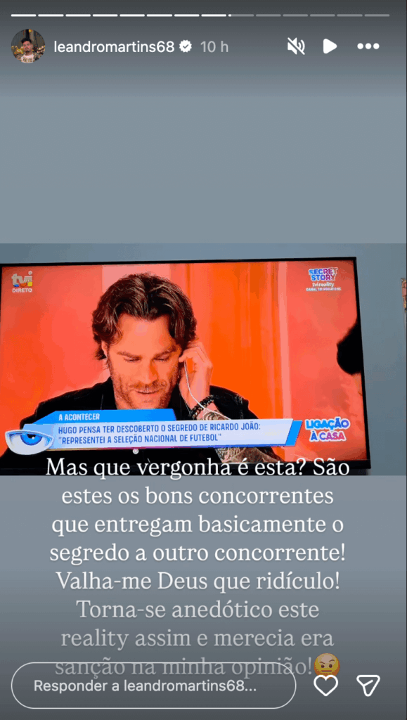 Ainda antes de a produção anunciar qualquer consequência para Ricardo, Leandro já tinha visto o suficiente para soltar a sua indignação nas redes sociais, questionando abertamente a postura do concorrente dentro da casa: “Mas que vergonha é esta? São estes os bons concorrentes que entregam basicamente o segredo a outro concorrente! Valha-me Deus que ridículo! Torna-se anedótico este reality assim e merecia era sanção na minha opinião!”
