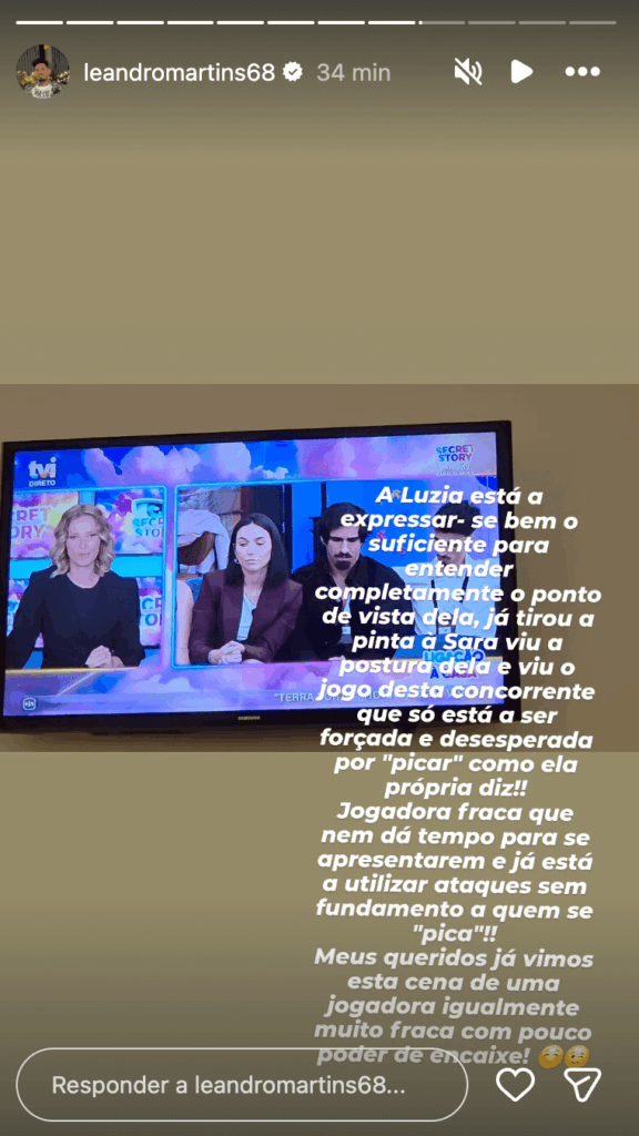 Leandro Martins começou por elogiar a forma como Luzia tem gerido os confrontos com Sara, considerando que a contabilista tem sido clara e assertiva: “A Luzia está a expressar-se bem o suficiente para entender completamente o ponto de vista dela, já tirou a pinta à Sara, viu a postura dela e viu que o jogo desta concorrente que só está a ser forçada e desesperada por ‘picar’ como ela própria diz!!”