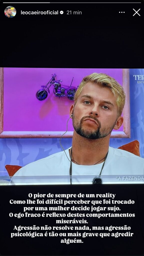“O pior de sempre de um reality: Como lhe foi difícil perceber que foi trocado por uma mulher decide jogar sujo. O ego fraco é reflexo destes comportamentos miseráveis.”, começou por dizer Léo Caeiro.
