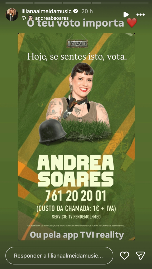 Liliana Almeida continua a acompanhar de perto os desenvolvimentos na 1.ª Companhia e não esconde quem é a sua “recruta” favorita. Com a amiga de longa data Andrea Soares novamente em risco de expulsão, a cantora e ex-concorrente do Big Brother Famosos utilizou as suas plataformas digitais para mobilizar os fãs e garantir a continuidade da artista na base militar de Bucelas.