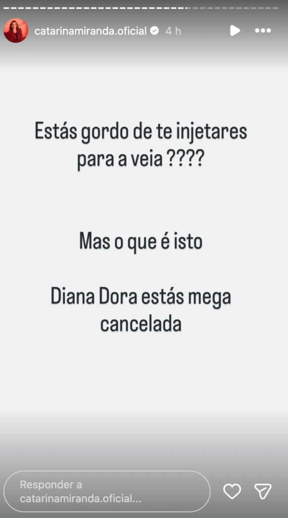 Catarina não parou por aí e continuou a atacar Diana Dora nas suas histórias do Instagram: “Estás gordo de te injetares para a veia? Mas o que é isto? Diana Dora, estás mega cancelada“.