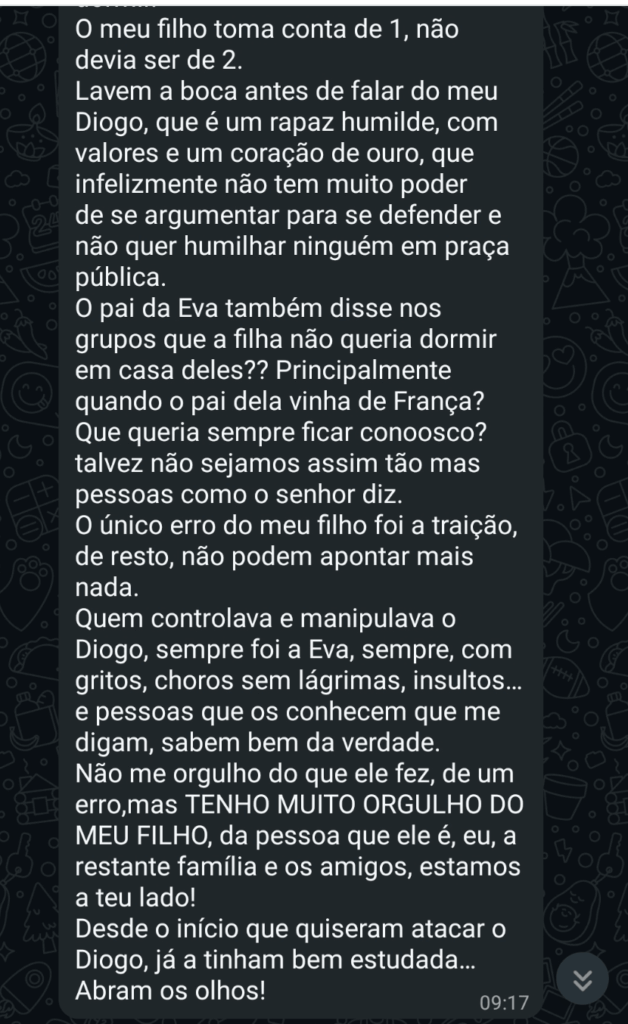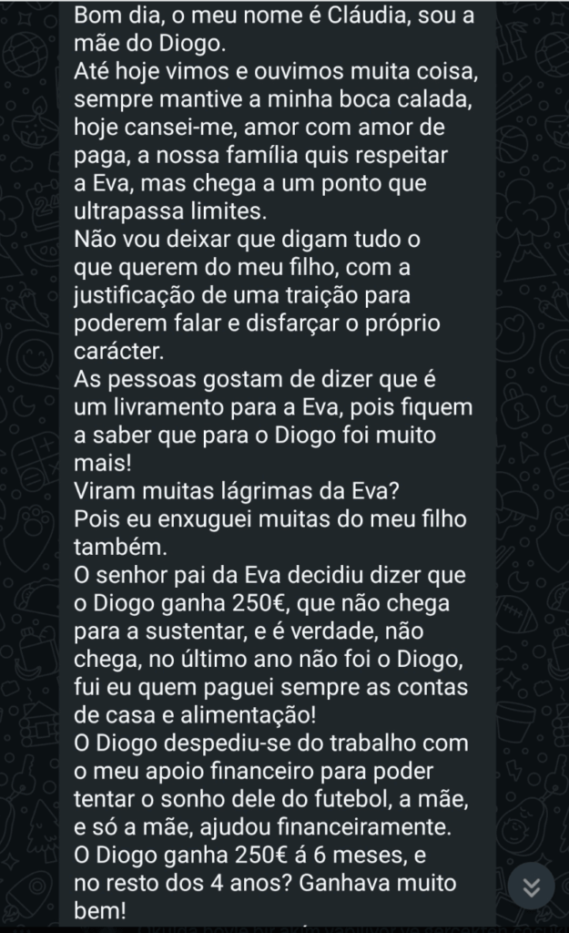 A autora das mensagens começa por explicar o que a levou a quebrar o silêncio depois de tanto tempo, deixando claro que chegou a um ponto em que não consegue continuar a ficar calada: “Bom dia, o meu nome é Cláudia, sou a mãe do Diogo. Até hoje vimos e ouvimos muita coisa, sempre mantive a minha boca calada. Hoje cansei-me. Amor com amor se paga. A nossa família quis respeitar a Eva, mas chega a um ponto que ultrapassa limites. Não vou deixar que digam tudo o que querem do meu filho, com a justificação de uma traição para poderem falar e disfarçar o próprio carácter.”