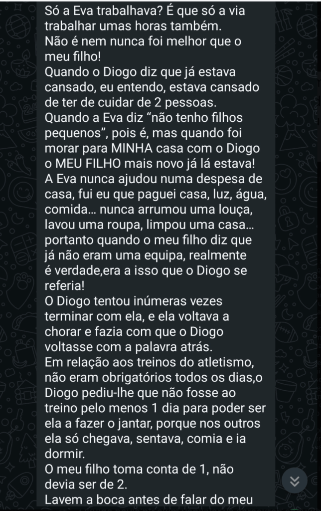 A autora das mensagens foi ainda mais longe e apresentou uma versão da dinâmica doméstica do casal que contraria completamente a narrativa que tem dominado o debate público: “Só a Eva trabalhava? É que só a via trabalhar umas horas também. Não é nem nunca foi melhor que o meu filho! Quando o Diogo diz que já estava cansado, eu entendo, estava cansado de ter de cuidar de 2 pessoas. A Eva nunca ajudou numa despesa de casa. Fui eu que paguei casa, luz, água, comida… nunca arrumou uma louça, lavou uma roupa, limpou uma casa. Portanto, quando o meu filho diz que já não eram uma equipa, realmente é verdade, era a isso que o Diogo se referia!”
