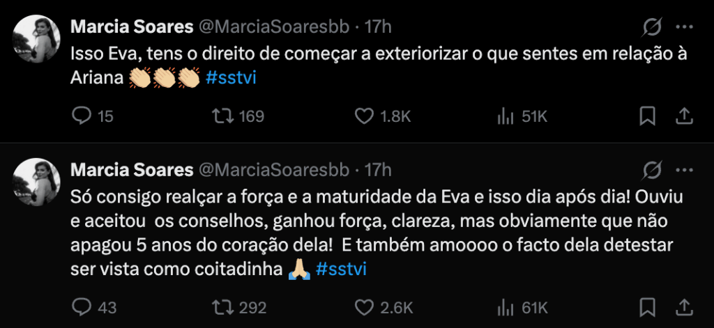 Cá fora, as reações não tardaram e Marcia Soares foi uma das primeiras a aplaudir a postura de Eva, elogiando a evolução da concorrente ao longo das últimas semanas: “Só consigo realçar a força e a maturidade da Eva e isso dia após dia! Ouviu e aceitou os conselhos, ganhou força, clareza mas obviamente que não apagou 5 anos do coração dela! E também amoooo o facto dela detestar ser vista como coitadinha.”