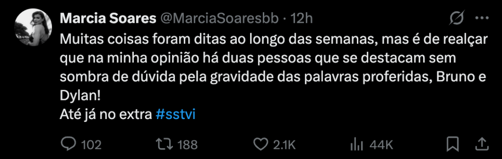 Antes de entrar no Extra, Marcia deixou bem claro nas suas redes sociais que não concorda com as atitudes dos dois concorrentes: “Muitas coisas foram ditas ao longo das semanas, mas é de realçar que na minha opinião há duas pessoas que se destacam sem sombra de dúvida pela gravidade das palavras proferidas, Bruno e Dylan! Até já no extra”.
