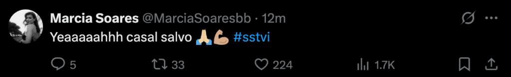 Marcia Soares tem-se mostrado atenta à gala e comentado alguns momentos na rede social X. A comentadora já reagiu à salvação do casalinho e celebrou nas redes sociais.