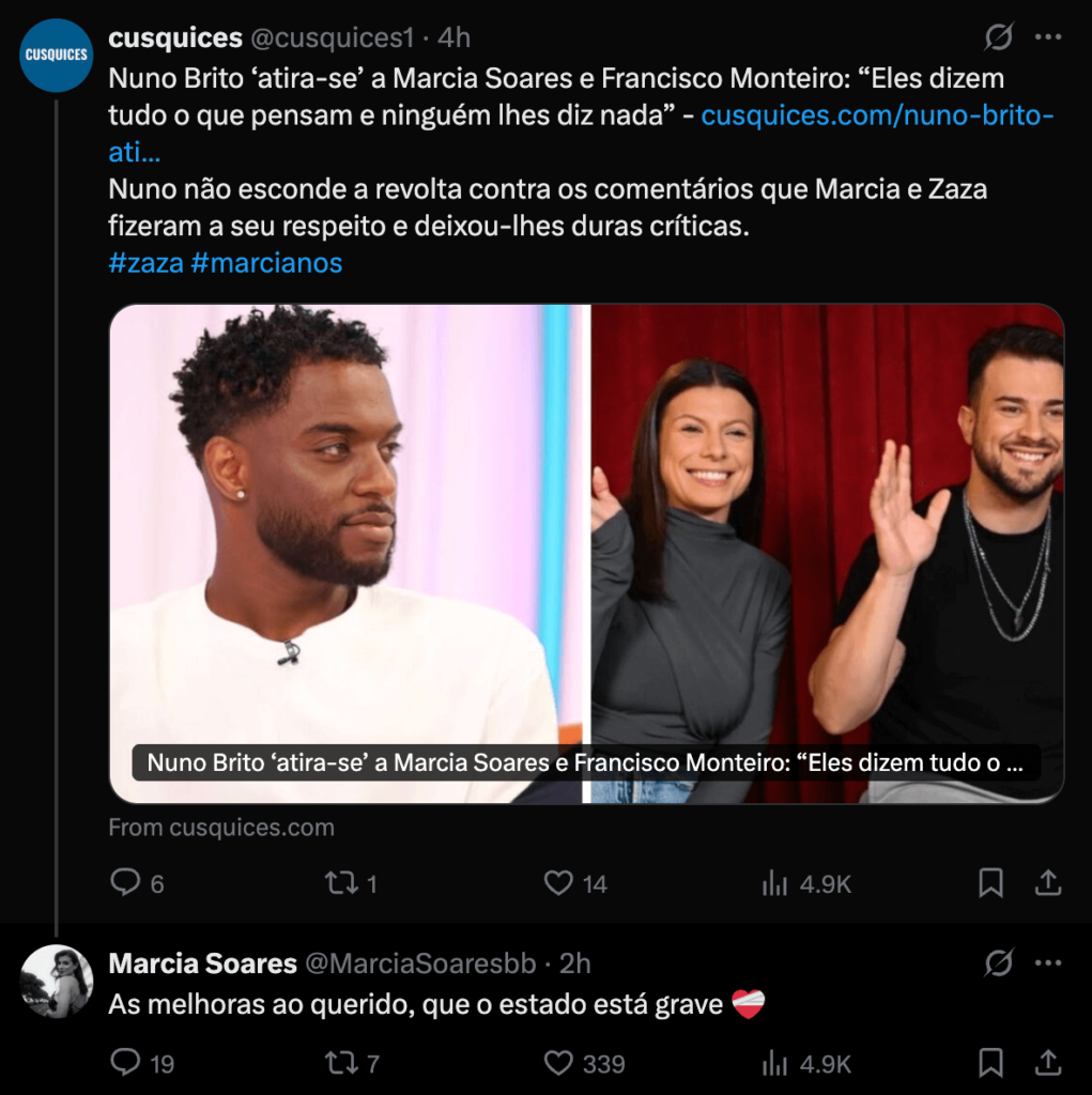 Marcia Soares não tardou a reagir, e deixou um comentário direto para Nuno Brito, carregado de ironia: “As melhoras ao querido, que o estado está grave”, podia ler-se na rede social X.