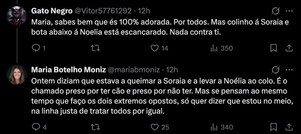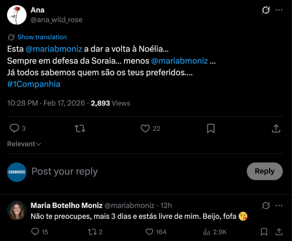A troca de argumentos começou quando um seguidor confrontou a apresentadora com a sua postura na condução das galas, acusando-a diretamente de proteger uma concorrente em detrimento da outra: “Esta @mariabmoniz a dar a volta à Noélia… Sempre em defesa da Soraia… menos @mariabmoniz… Já todos sabemos quem são os teus preferidos…”. Perante a acusação de favoritismo, Maria Botelho Moniz optou por responder com ironia, lembrando que o formato está prestes a terminar: “Não te preocupes, mais três dias e estás livre de mim. Beijo, fofa.”