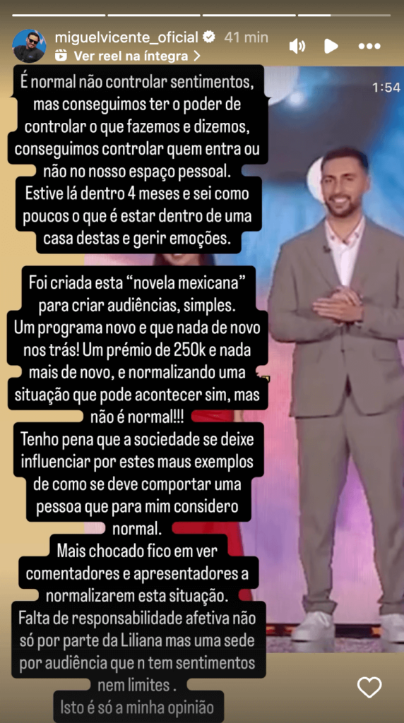 Miguel Vicente apontou ainda o dedo a alguns comentadores da TVI: “Mais chocado fico em ver comentadores e apresentadores a normalizarem esta situação. Falta de responsabilidade afetiva não só por parte da Liliana mas uma sede por audiência que n tem sentimentos nem limites. Isto é só a minha opinião”.