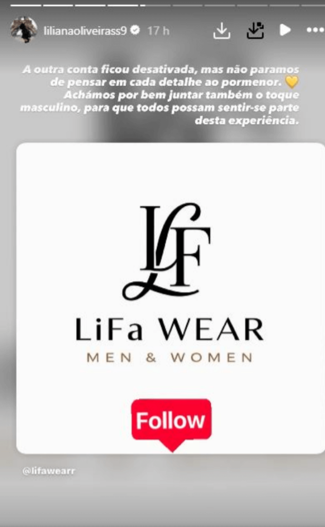 Na descrição do perfil, o casal detalhou o conceito e os objetivos da nova marca: “Bem-vindos à Lifa Wear! Somos a Liliana e o Fábio e criámos a Lifa Wear com um objetivo: trazer uma experiência de moda online diferente de tudo o que já viram. Aqui, não é só sobre roupas, é sobre estilo, diversão e surpresas a cada clique. Na nossa loja online, vais encontrar looks incríveis para mulher e homem, pensados para que te sintas confiante e confortável em qualquer ocasião. E, porque sabemos que os detalhes fazem toda a diferença, as meias também têm o seu lugar especial na nossa coleção.”
