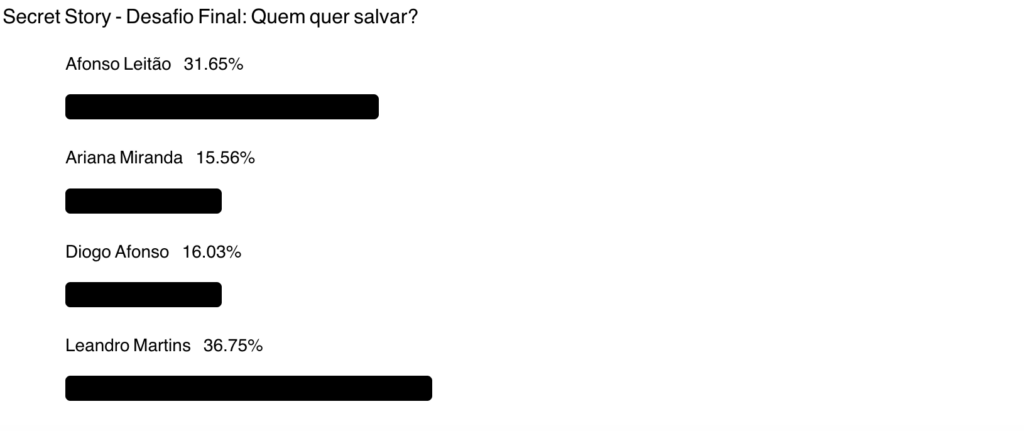 3º Diogo Afonso – 16,03% (🔺 1,02% face a ontem): Diogo subiu para o terceiro lugar, mas com uma diferença mínima do último lugar. Diogo entrou com uma postura calma e pacífica, muito semelhante à sua participação no Secret Story 8, resta saber se entre a turbulência, Diogo se safará da primeira expulsão.