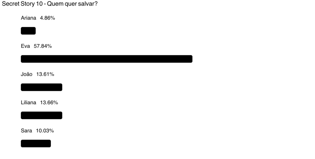 A tendência é clara: se nada mudar até domingo, Eva pode ser a primeira salva e Ariana poderá ser a concorrente expulsa desta semana. Recorde-se que a sondagem não é uma votação oficial e os votos que contam são as chamadas telefónicas e os votos na app da TVI. Pode continuar a participar na nossa sondagem aqui.
