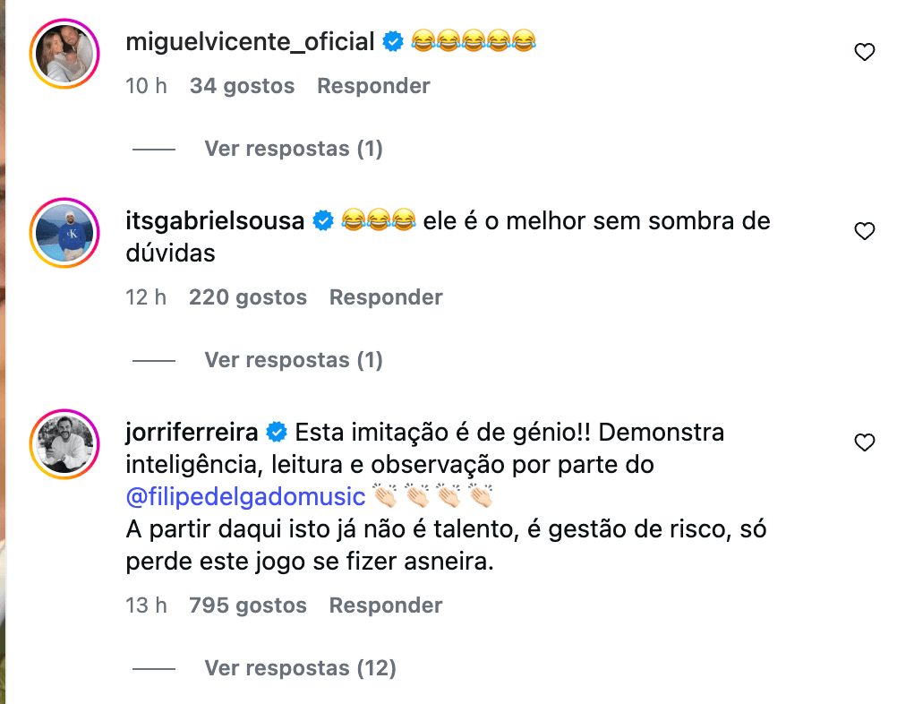 Mas Miguel Vicente, não foi o único a reagir, Gabriel Sousa, João Ricardo e Daniel Monteiro, também reagiram ao momento icónico do cantor. Gabriel, ex-concorrente do Big Brother 2024, não tem dúvidas: “ele é o melhor sem sombra de dúvidas”. João Ricardo, ex-concorrente do Secret Story 8, também não têm dúvidas que Filipe é o potencial vencedor do reality show: “Esta imitação é de génio!! Demonstra inteligência, leitura e observação por parte do @filipedelgadomusic A partir daqui isto já não é talento, é gestão de risco, só perde este jogo se fizer asneira.” Por sua vez, Daniel Monteiro, ex-concorrente do BB2020, também se mostrou rendido ao cantor: “muitoooooooo bom mesmo, está aí um futuro belo instrutor para umas belas instruções de calistenias de Moutinho, só tem que dizer “encosta lá bem o calcanhar a estaca””, que acrescentou ainda vários emojis a chorar a rir.