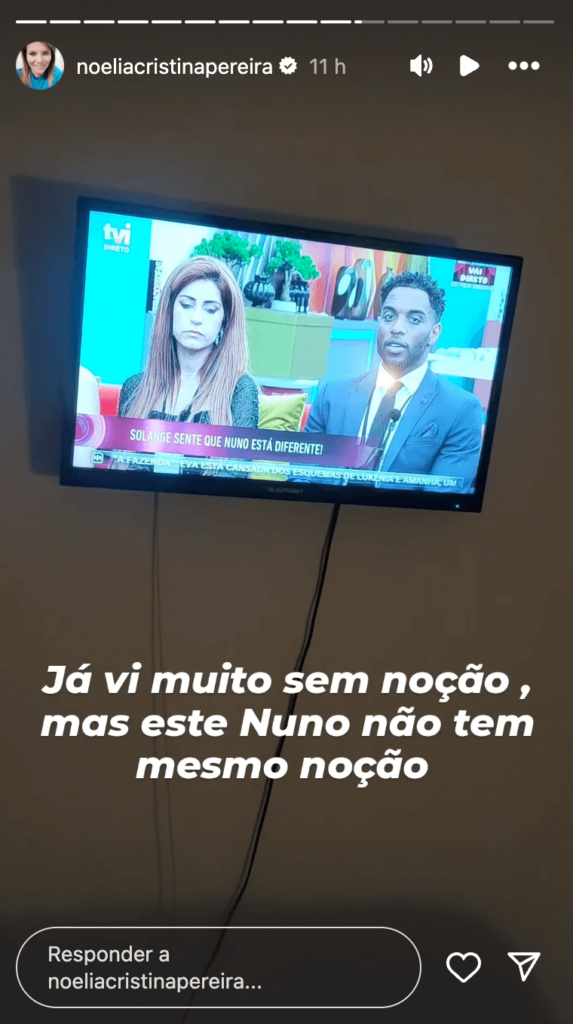 “Estou estupefacta com as palavras do Nuno, isto não é normal…”, disse Noélia no vídeo em que se mostrou a ver a gala, na legenda do vídeo acrescentou: “Já vi muito sem noção, mas este Nuno não tem mesmo noção”.