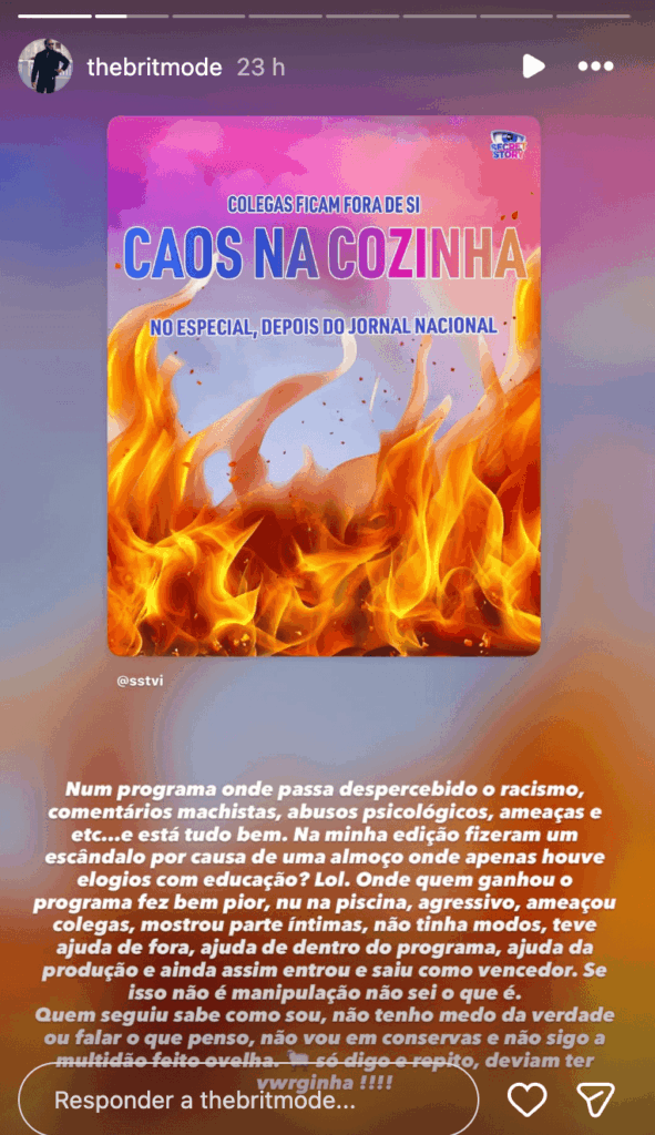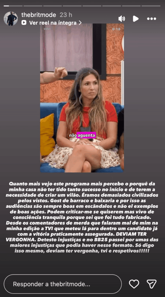 Para rematar, Nuno Brito não poupou nem a TVI nem os comentadores que o criticaram durante a sua edição, deixando uma acusação direta e sem filtros: “Desde os comentadores de merda que falaram mal de mim na minha edição, à TVI que meteu lá para dentro um candidato já com a vitória praticamente assegurada. DEVIAM TER VERGONHA. Detesto injustiças e no BB25 passei por uma das maiores injustiças que podia haver nesse formato. Só digo isso mesmo, deviam ter vergonha, TVI e respetivos!!!!!”.