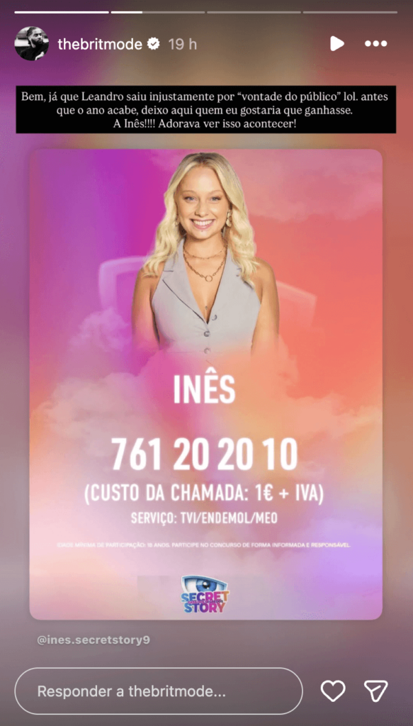 “Bem, já que Leandro saiu injustamente por “vontade do público” lol. Antes que o ano acabe, deixo aqui quem eu gostaria que ganhasse. A Inês!!!!”, revelou Nuno Brito, que acrescentou: “Adorava ver isso acontecer!”