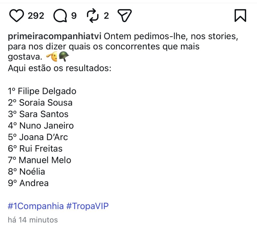 A espera terminou e os dados oficiais já estão cá fora! A TVI acaba de revelar os resultados do ranking de popularidade dos recrutas da 1ª Companhia desta semana.