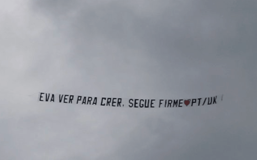 Um novo avião sobrevoou a casa mais vigiada do país com mais uma mensagem dirigida a Eva: “EVA VER PARA CRER. SEGUE FIRME. PT/UK”, podia ler-se, numa dedicatória que contou com o apoio de fãs tanto em Portugal como no Reino Unido.