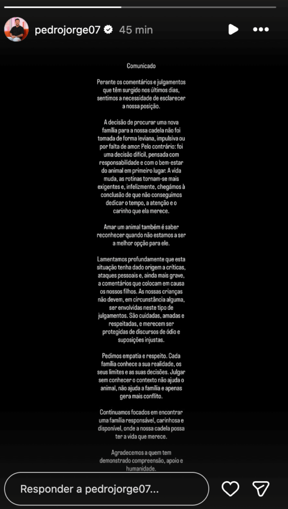O vencedor do Secret Story 9 começou por esclarecer que a decisão de procurar um novo lar para o animal não foi tomada de forma impulsiva: “Perante os comentários e julgamentos que têm surgido nos últimos dias, sentimos a necessidade de esclarecer a nossa posição. A decisão de procurar uma nova família para a nossa cadela não foi tomada de forma leviana, impulsiva ou por falta de amor. Pelo contrário: foi uma decisão difícil, pensada com responsabilidade e com o bem-estar do animal em primeiro lugar. A vida muda, as rotinas tornam-se mais exigentes e, infelizmente, chegámos à conclusão de que não conseguimos dedicar o tempo, a atenção e o carinho que ela merece.”