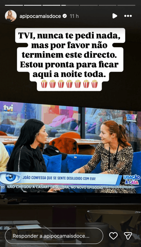 Tão entusiasmada com o desenrolar dos acontecimentos, Pipoca não resistiu a fazer um apelo direto à TVI, prometendo não sair do lugar enquanto houver direto para ver: “TVI, nunca te pedi nada, mas por favor não terminem este direto. Estou pronta para ficar aqui a noite toda.”