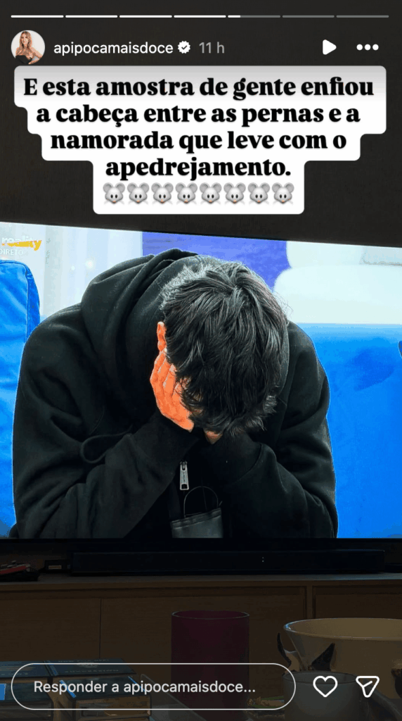 Já sobre Ariana, a “Pipoca” assumiu uma posição que poucos têm tido a coragem de defender publicamente, lembrando que a concorrente também não é completamente inocente nesta história: “Ariana, calma contigo, que também não tens essa moral toda. Sabias que ele tinha uma namorada e seguiste com a brincadeira. A única diferença é a namorada estar na casa.”