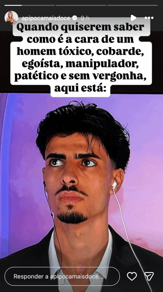 Ana Garcia Martins, mais conhecida como ‘Pipoca Mais Doce’, não ficou calada perante o que viu e foi direta na análise a cada um dos envolvidos. Sobre Diogo, a influencer não deixou margem para interpretações: “Quando quiserem saber como é a cara de um homem tóxico, cobarde, egoísta, manipulador, patético e sem vergonha, aqui está.”