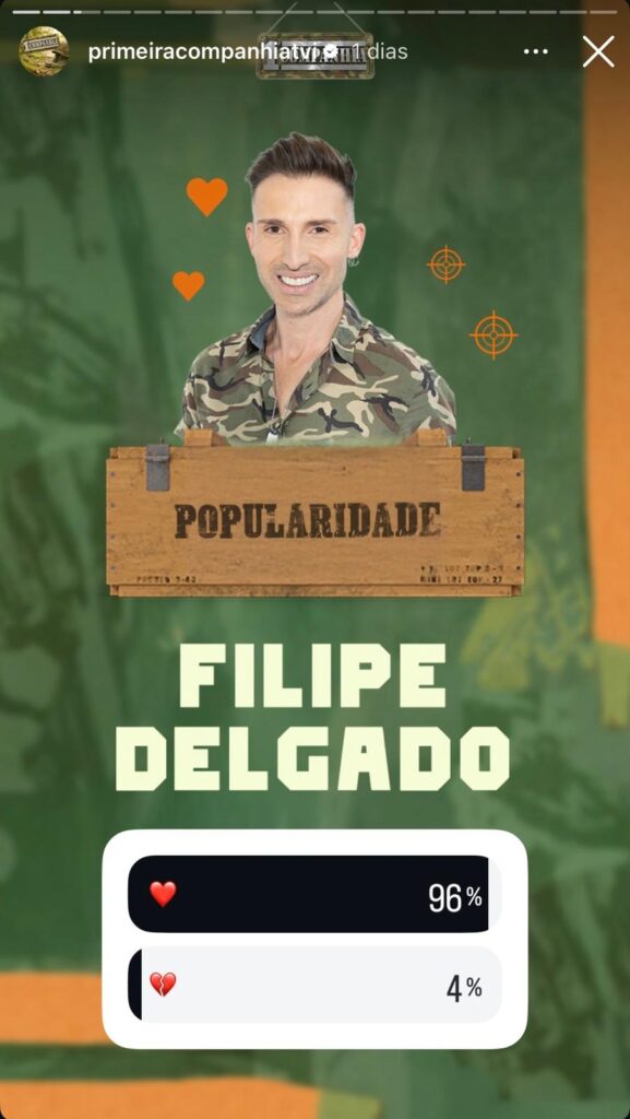 Filipe Delgado continua a manter-se como o favorito do público com 96% de gostos, deixando apenas 4% de rejeição. É o valor mais alto registado até agora, confirmando que o seu carisma e autenticidade o tornam, para já, imbatível na corrida pelo mais popular da semana. Por sua vez, Andrea Soares é até ao momento a concorrente menos gostaga com apenas 30% dos votos.