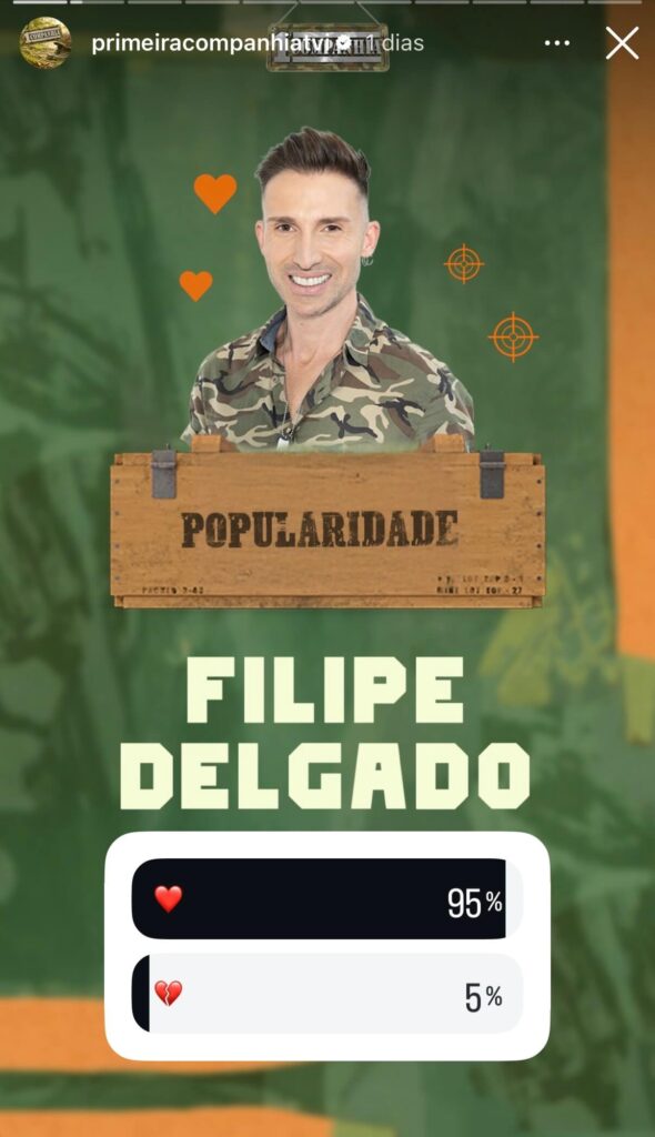 Na última semana do reality show, Filipe Delgado continua a manter-se como o favorito do público com 95% de gostos, deixando apenas 5% de rejeição. É o valor mais alto registado até agora, confirmando que o seu carisma e autenticidade o tornam, para já, imbatível na corrida pelo mais popular da semana. Por sua vez, Noélia Pereira é até ao momento a concorrente menos gostada com apenas 30% de gostos.