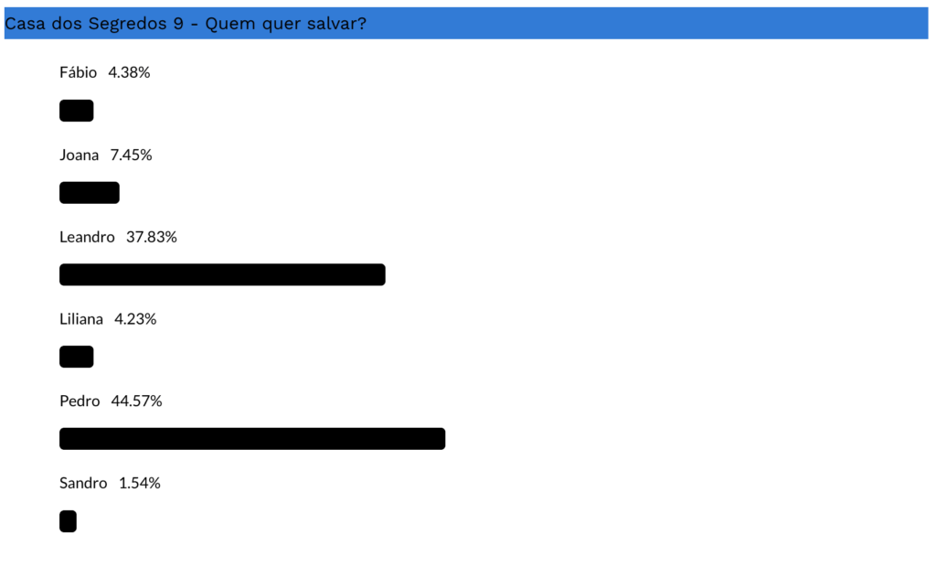 Na sondagem que decorre no nosso blog, Pedro Jorge é o concorrente mais votado para salvar com 44,57% dos votos, seguido de Leandro com 37,83% dos votos e Joana com 7,45% dos votos. Já entre os menos votados temos, Fábio com 4,38% dos votos, Liliana com 4,23% dos votos e Sandro com 1,54% dos votos.
