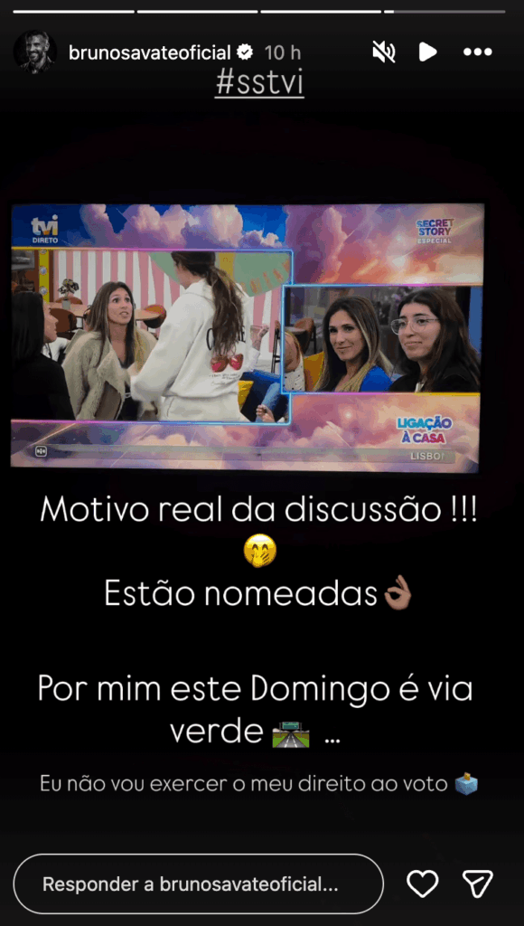 No entanto, Bruno Savate, surpreendeu com a decisão inesperada sobre as nomeações desta semana. Ao contrário do que é habitual, Savate, que frequentemente mobiliza os seus seguidores para o voto nos seus favoritos, optou por uma postura de neutralidade que apanhou os fãs de surpresa. Sobre quem deverá abandonar o programa no domingo, o nortenho revelou que não irá interferir no desfecho desta ronda, pois é-lhe indiferente quem sai esta semana: “Por mim este Domingo é via verde. Eu não vou exercer o meu direito ao voto”.