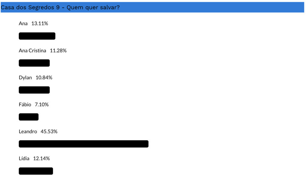 Com 45,53% dos votos, Leandro é o concorrente mais votado para salvar, seguido de Ana com 13,11% dos votos, Lídia com 12,14% dos votos e Ana Cristina com 11,28% dos votos. Dylan e Fábio são menos votado para salvar com 10,84% e 7,10% dos votos respetivamente.