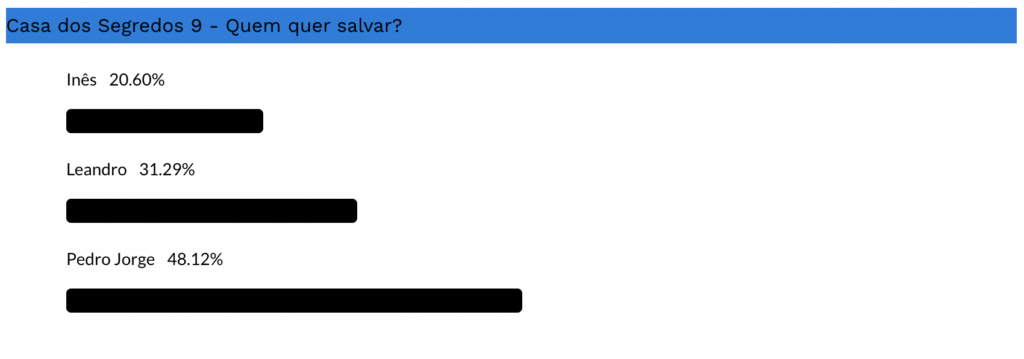 Recorde-se que Pedro Jorge tem liderado consecutivamente o ranking de popularidade publicado pela TVI na página oficial de Instagram do Secret Story. O jovem empresário foi nomeado diversas vezes ao longo da competição, tendo sido salvo em primeiro lugar na maioria das ocasiões. Leandro também se tem mantido bem posicionado no ranking, sendo consistentemente salvo nos primeiros lugares sempre que esteve em risco de expulsão. Já Inês Gama tem figurado entre as menos populares junto do público, embora tenha conseguido sobreviver a todas as nomeações até ao momento. Agora, a concorrente conta com o forte apoio do namorado Dylan, que já prometeu fazer todos os esforços possíveis para a levar à vitória. Quem será que fica de fora da final?