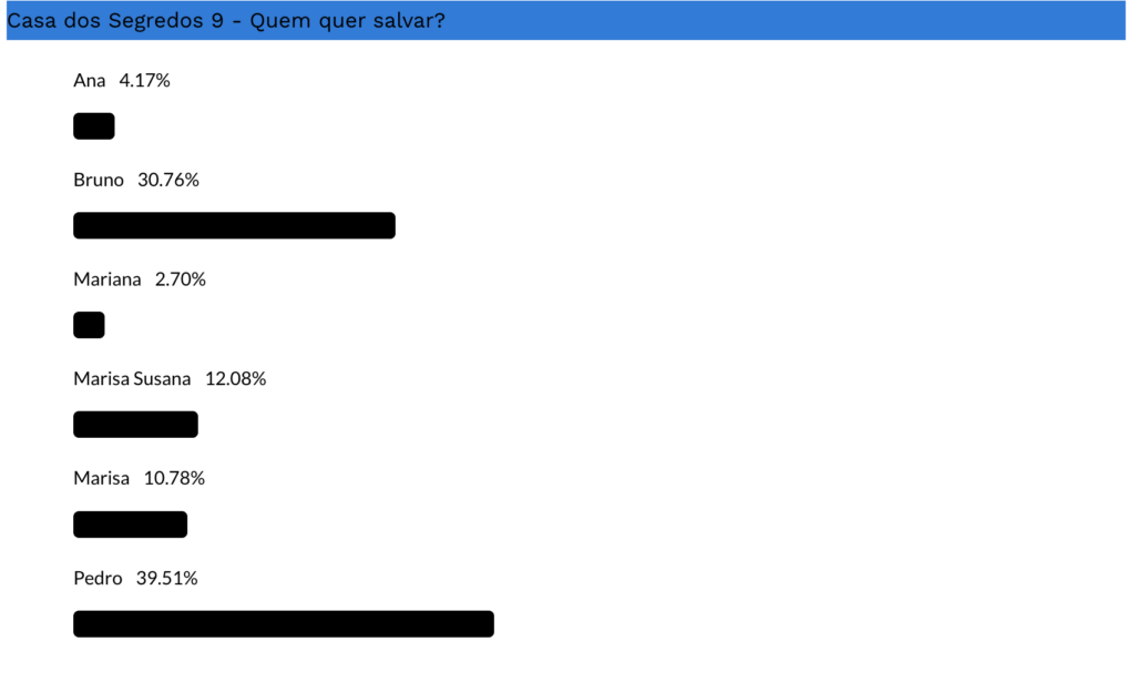 Com 39,51% dos votos, Pedro Jorge é o concorrente mais votado para salvar, seguido de Bruno com 30,76% dos votos. Segue-se Marisa Susana com 12,08% dos votos e Marisa com 10,78% dos votos. Entre os menos votados temos um duelo renhido entre Ana com 4,17% dos votos e Mariana com 2,70% dos votos.
