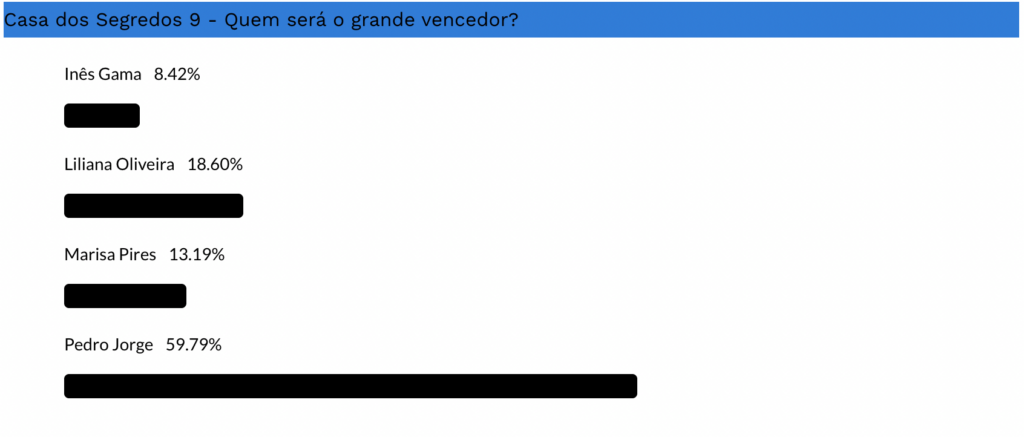 Os números revelam uma vantagem confortável para Pedro Jorge, que ao longo da competição se manteve consistentemente como o favorito do público nos rankings de popularidade. No entanto, a votação oficial da TVI poderá reservar surpresas, como já aconteceu na semifinal. De recordar que Marisa Pires também se destacou semana após semana, entre os primeiros lugares do ranking de popularidade, já Liliana e Inês mantiveram-se quase sempre nos últimos lugares do ranking .